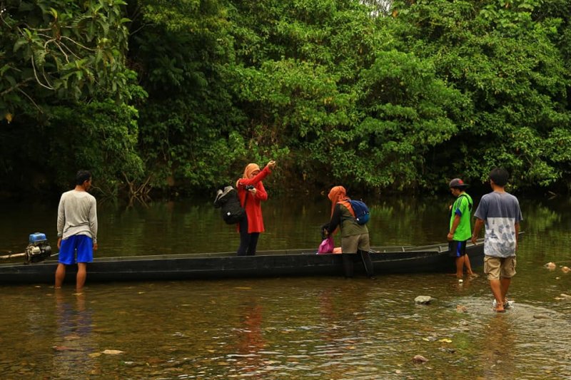 Setelah menempuh 30 menit, kemudian treking dari lokasi bibir sungai hingga ke spot utama yang jaraknya 1,2 Km dari kawasan hutan kira-kira 30 menit.
