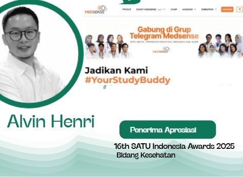 Dedikasi dan dampak nyata dari Alvin Henri melalui Medsense tidak luput dari perhatian nasional. Berkat kontribusinya yang luar biasa dalam mendukung pendidikan tenaga medis, Alvin dianugerahi Apresiasi Bidang Kesehatan dalam ajang bergengsi 16th SATU Indonesia Awards 2025.